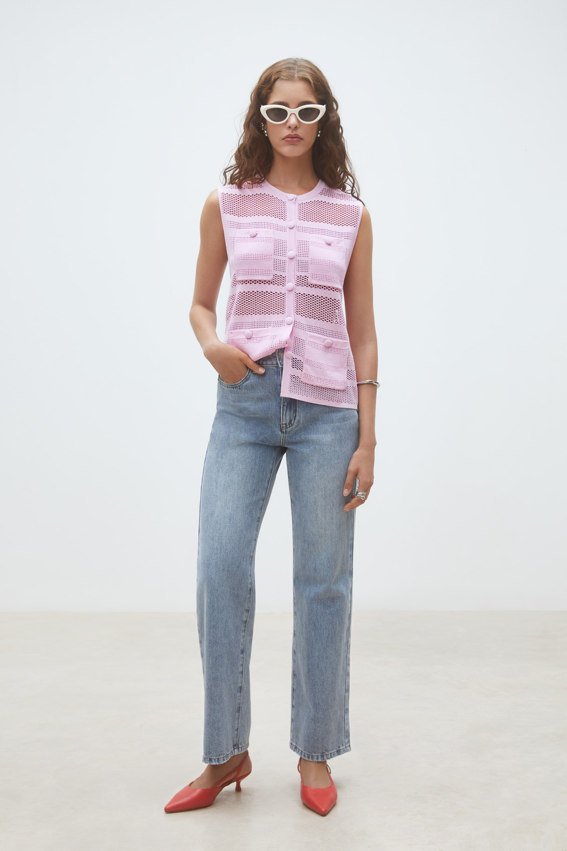-Openwork sleeveless cardigan -Tone-on-tone button closure -Two buttoned patch pockets on the chest -Two side patch pockets with buttons